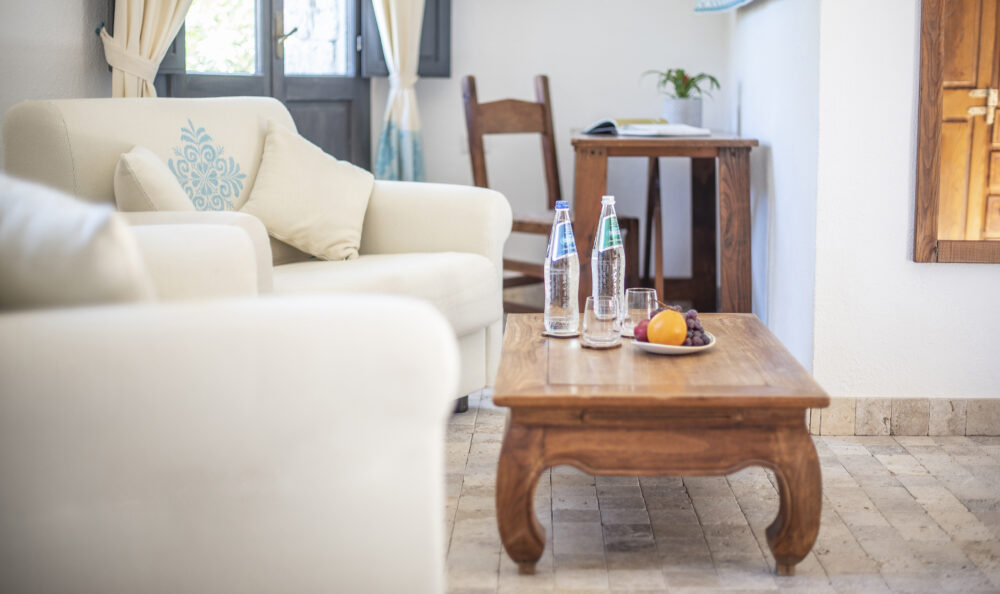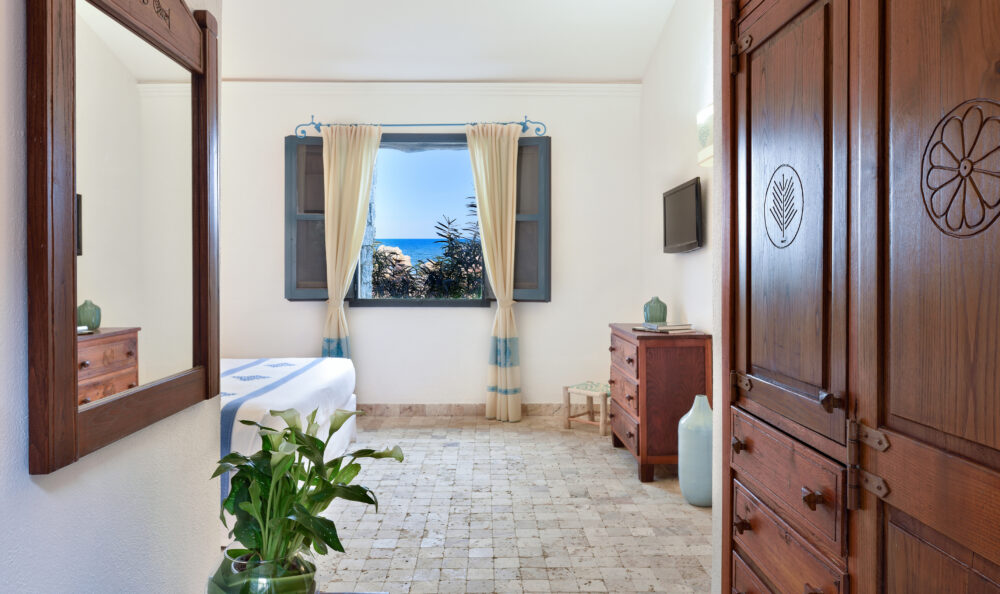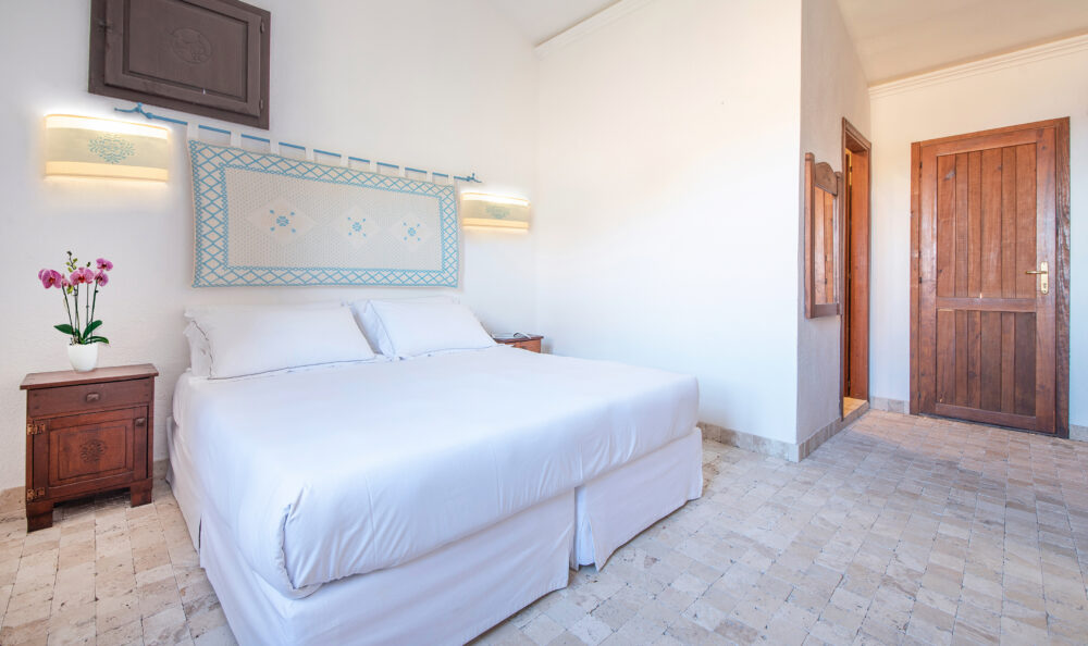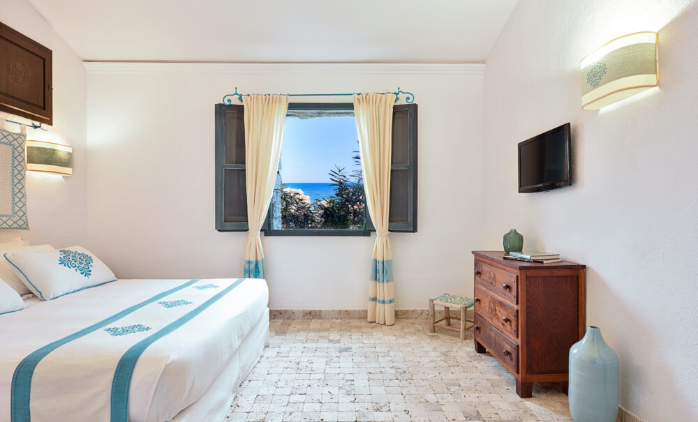 Borgo Cala Moresca has 225 rooms and looks like a typical Sardinian village. Its special charm is the result of a careful recovery of old materials, from wrought-iron and juniper lintels to granite and typical Sardinian tiling. In a wonderful location overlooking the sea, it is ideal for the most demanding of customers who are seeking relaxation and tranquillity. In Borgo Cala Moresca’s central square, there is the bar, central restaurant with large panoramic dining rooms and terraces, and a large swimming pool. In the park below, there is the amphitheatre, a second pool and, on a scenic terrace overlooking the sea, La Vela restaurant serving delicious seafood specialties. The bay of Cala Moresca is 150 to 300 metres from the rooms: large sand terraces extending as far as the sea, where you’ll find a wooden deck equipped with umbrellas and sun loungers.